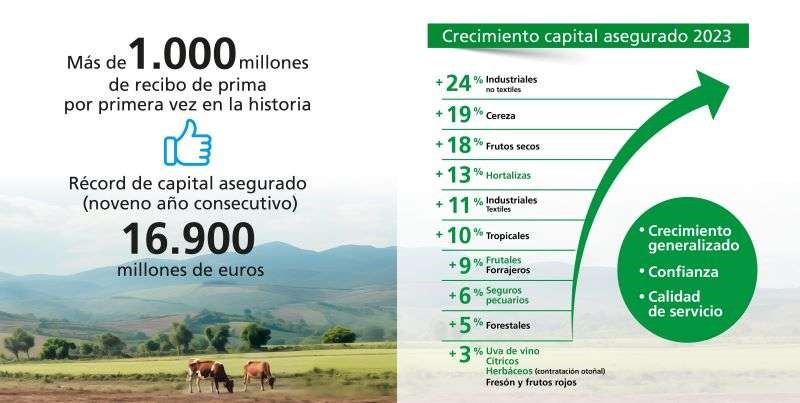 El capital asegurado por el seguro agrario ha marcado récord por noveno año consecutivo tras crecer un 3% en 2023 y situarse en 16.918 millones de euros. Este incremento viene impulsado por el aumento en la contratación del seguro en las principales producciones del campo español: hortalizas (+12%), frutales (+9%), cítricos (+3%), uva de vino (+3%) o el conjunto de los seguros pecuarios (+6%), así como en otras líneas de seguro, como las que cubren producciones industriales textiles y no textiles, cereza, frutos secos, cultivos tropicales, forrajeros, uva de mesa, fresón y frutos rojos, planta viva o producciones forestales, entre otras.